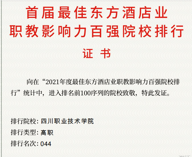 为推动现代职业教育高质量发展,做好高等职业学校适应社会需求能力评估是基本前提。依托“最佳东方-旅游服务业的招聘求职平台”600万+酒店与旅游企业注册用户,及人才供需信息相关的1248所院校数据,最佳东方酒店与旅游人才职业发展研究院以“院校行业活跃度”和“院校企业关注度”为评价结构,以院校专业人才培养输送数量及办学质量在酒店业中的实际影响研究为目的,进行了教育贡献统计分析,日前,发布了“最佳东方酒店业教育贡献院校”排行榜,其中高职院校300所、本科院校150所。四川职业技术学院荣获“首届最佳东方酒店业职教影响力百强院校”排名第44名。