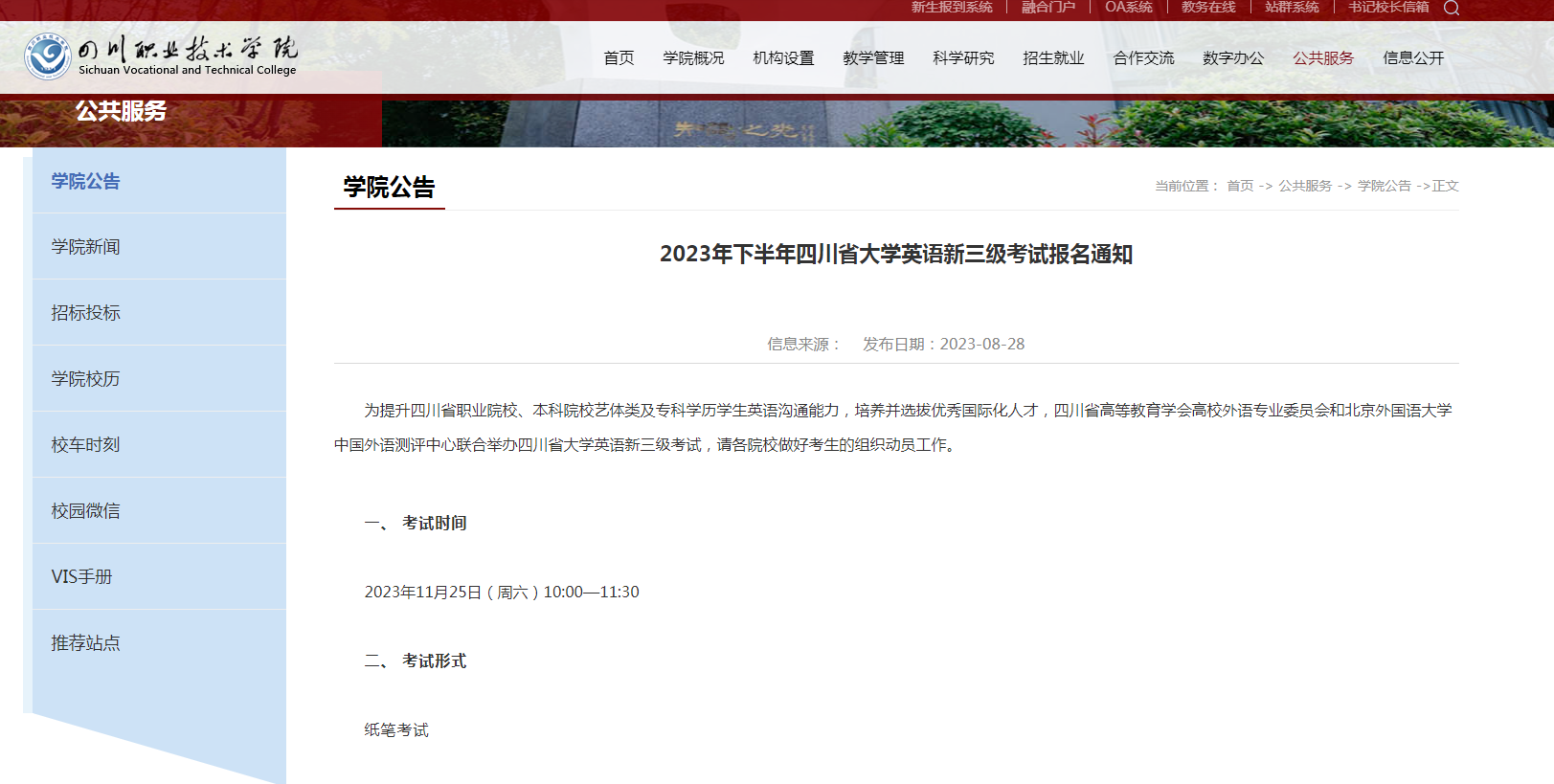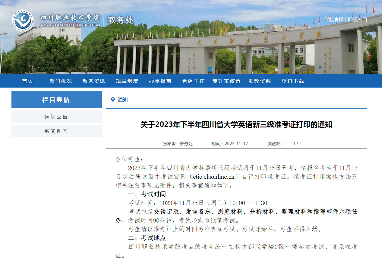 11月25日上午,2023年下半年四川省大学英语新三级考试(国际人才英语考试-初级)在我校本部尚学楼C区顺利举行。