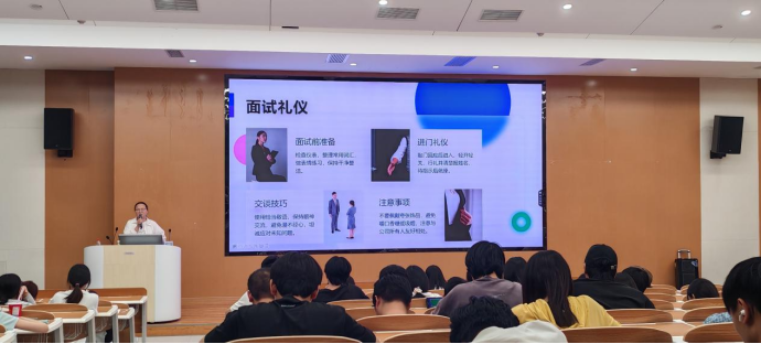 讲座聚焦就业心理调适、信息收集、材料准备及面试技巧。赵老师首先分析了求职中常见的九大心理问题,如自卑、自傲、焦虑等,指出其成因多源于自我认知偏差或外部压力,并给出调适方法:通过梳理优势短板建立理性认知,借助呼吸冥想缓解焦虑,以模拟面试增强自信,同时建议通过提升专业技能、扩展社交圈强化心理韧性。