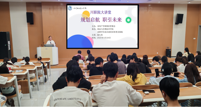 5 月 20 日晚 7:30-9:10,由龙凤产业园管委会主办、食品与生物技术学院及四川省高职学生综合素质训育普及基地承办的 “规划启航,职引未来” 大学生就业指导讲座在龙凤产学研园区 B5-101 教室举行,创新创业指导师赵久英副教授担任主讲人,近 200 名师生现场聆听。