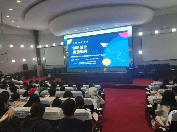 2025年11月4日上午,四川职业技术学院学术报告厅内气氛热烈,由四川省高职学生综合素质训育普及基地与四川职业技术学院大学生众创空间联合承办的“川职院大讲堂”专题讲座成功举行。本次活动特邀省级创业导师、企业人力资源管理专家马文娟女士,为现场230余名学生带来了一场以“构建理性基石——创新创业思维与项目可行性分析”为主题的精彩讲座。此次讲座系2025年“创梦天府”创业指导活动暨遂宁市人社服务进高校系列活动的重要组成部分,也是四川省高职学生综合素质训育普及基地深入推进创新创业素质训育的系列活动。