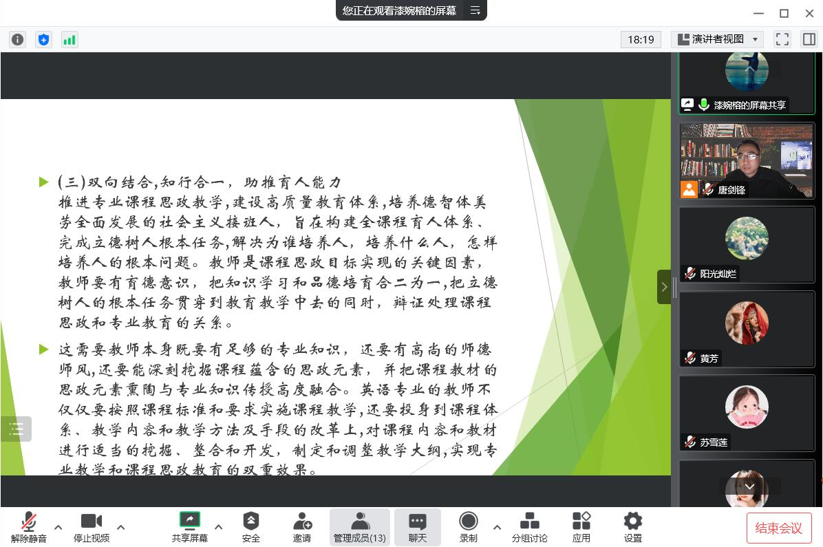漆婉榕老师在汇报中谈到:教育大计,教师为本,教师之本在于立德;要立德树人,首先就要加强职业道德建设自觉性,做好学生引路人。教师要有育德意识,把知识学习和品德培育合二为一,把立德树人的根本任务贯穿到教育教学中去的同时,辩证处理课程思政和专业教育的关系。汇报同时,漆婉榕老师以自己的教育实践为例,介绍了将师德师风建设融入课堂的有效途径,为我院如何更好的培养有情怀的教育接班人提供了参考。