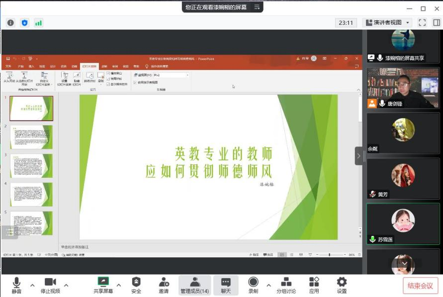 为了进一步加强师德师风建设,持续深入推进教育教学改革成效,为培养高素质合格人才提供有利的师资环境,四川职业技术学院外国语学院应用英语教研室于2022年12月1日19:30开展了以“师德师风建设”为主题的教学研讨活动,本次活动由教研室主任唐剑锋老师主持,英语教育专业专任教师漆婉榕分享了“英语教育专业如何贯彻师德师风建设”的主题汇报,小学英语教育专业和商务英语专业的专任教师参加了此次活动。