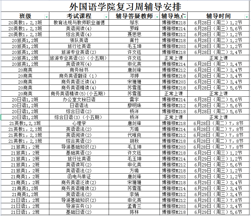 根据期末教学工作安排,第19周(6月27日——7月2日)为复习周。为保障复习相关工作的顺利进行,外国语学院根据我院实际教学情况,将复习周集中辅导答疑安排如下表: