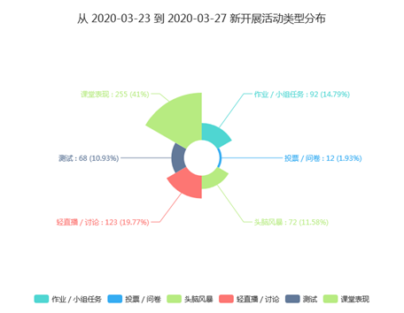 182条活动记录,使用了轻直播、头脑风暴、课堂表现、测试、小组任务、投票等形式 |
