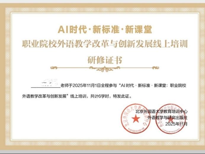 随着人工智能技术的飞速发展,教育领域正迎来深刻变革。为主动适应新趋势,探索智慧教学新模式,11月1日,教研室组织教师们参加了主题为“AI时代职业院校外语教学改革与创新发展”的线上培训。此次培训深入剖析了AI技术在外语教学中的应用场景、潜在优势与挑战,介绍了智能评测、个性化学习路径、人机协同教学等前沿理念与实践案例。