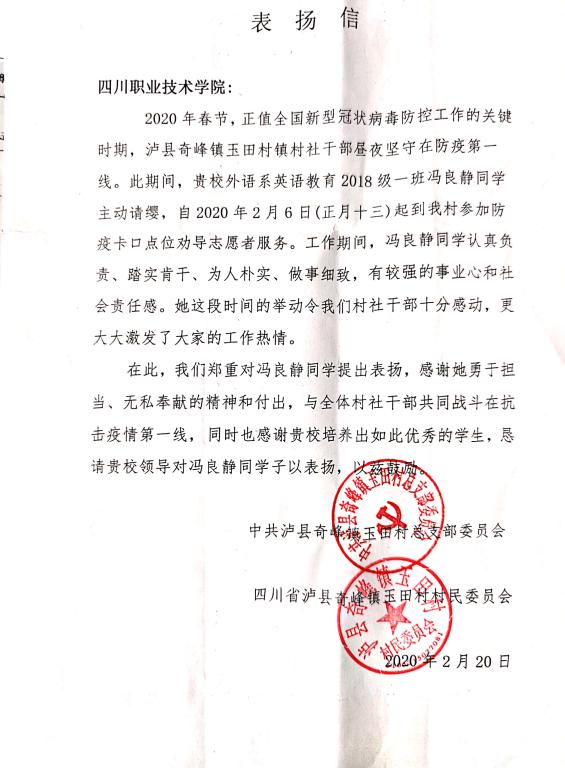 教学十总支党员教师代唯良同志,于2020年2月14-2月20日期间,每天上午在遂宁北高速路口参与志愿服务,负责登记来往车辆及乘客信息。教学十总支党员教师龚竹同志,在2020年2月20-2月29日,每天上午在河东新区灵泉街道香林雅郡社区值守,负责测体温、填写出入者信息、发放宣传资料、代购生活物资等;还有部分党员教师通过进社区,普及科学防疫常识,通过网络,对学生进行心理健康疏导,这些党员同志都以实际行动向我们一线的抗疫英雄致敬,充分体现了党员同志的无私奉献精神和模范先锋作用;由于疫情,同学们暂时不能返校学习,他们只能在家上网课,我系不少学生在这个特殊时期,依然积极参加抗击疫情活动,其中不乏我们的入党积极分子,18级旅游英语2班范诗茂同学、18级英语教育1班冯良静同学在疫情期间主动请缨,参加家乡防疫卡口点位劝导志愿者服务工作。期间,这两位同志认真负责、踏实肯干、做事细致,具有较强的奉献精神和社会责任感,并受到当地政府的认可和表扬。