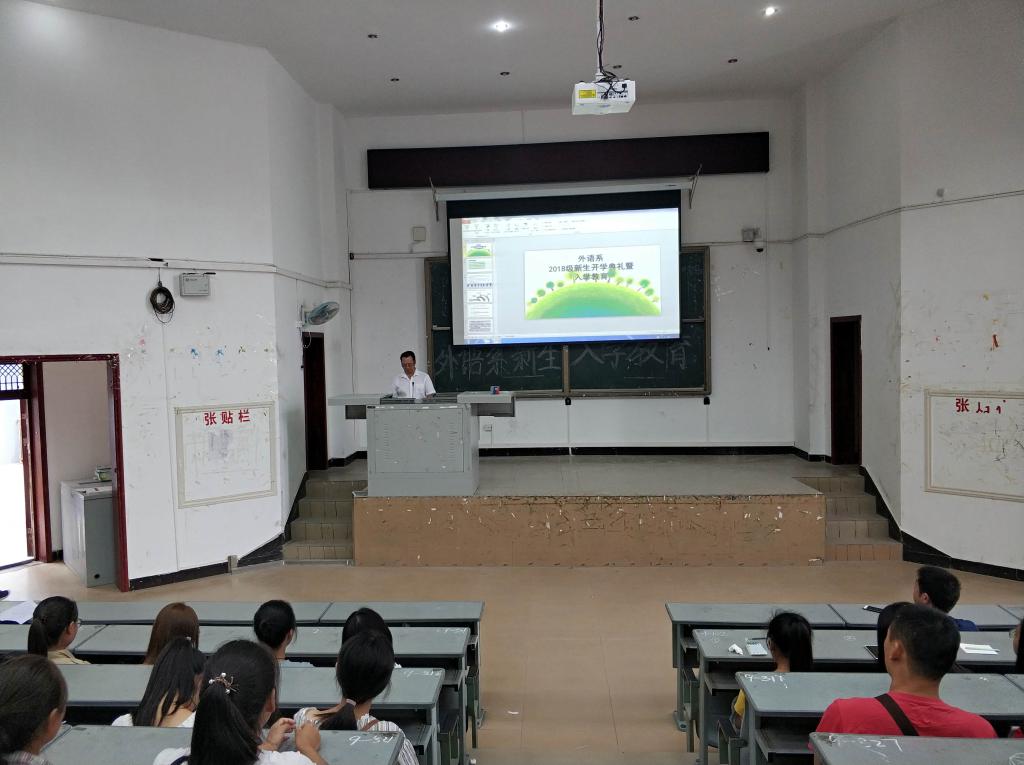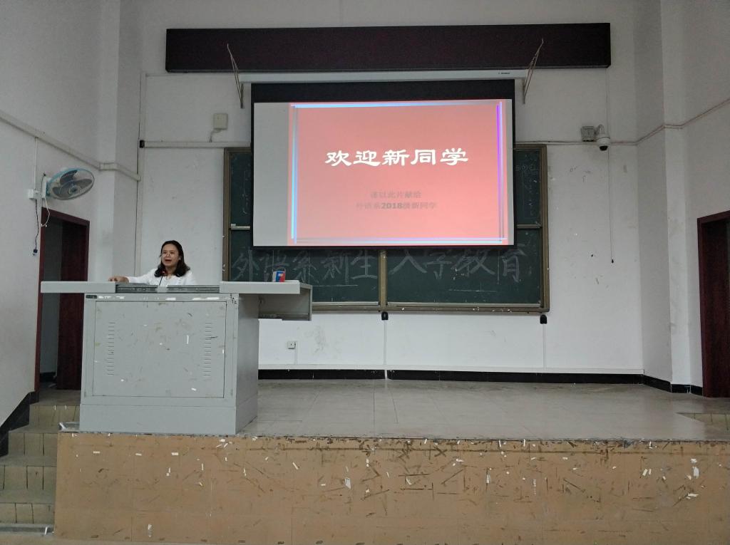 繁忙的迎新工作圆满结束,为帮助新生尽快适应大学的学习和生活,顺利、平稳、有效地实现从中学到大学。外语系于2018年9月10日下午在D101教室进行了我系2018级新生开学典礼暨入学教育。外语系党总支书记钟永发、副主任谭爱平、团总支书记王娅莉及各教研室专业负责人和2018级辅导员徐艺凌参加了本次大会。