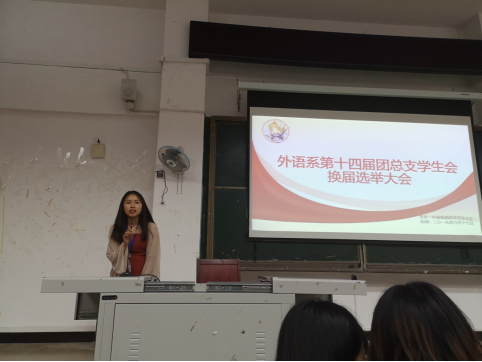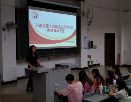2019年6月17日晚上7:00在B109隆重举行了第十四届外语系团总支学生会干部换届选举大会。外语系团总支书记王娅莉老师以及副书记王绪淑、学生会主席蔡鸿文、副主席王晓宇出席此次大会。参加此次选举大会的还有各部门负责人以、参赛选手及各相关部门干事等。
