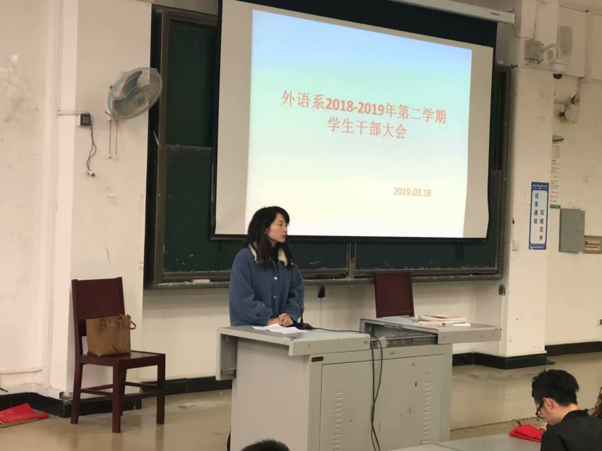 2018年3月18日晚6点10分,外语系新学期第一次学生干部大会在B101顺利开展,参加本次会议的有我系团总支书记王娅莉老师、团总支副书记王绪淑、学生会主席蔡鸿文、副主席王晓宇以及各部门负责人和干事。