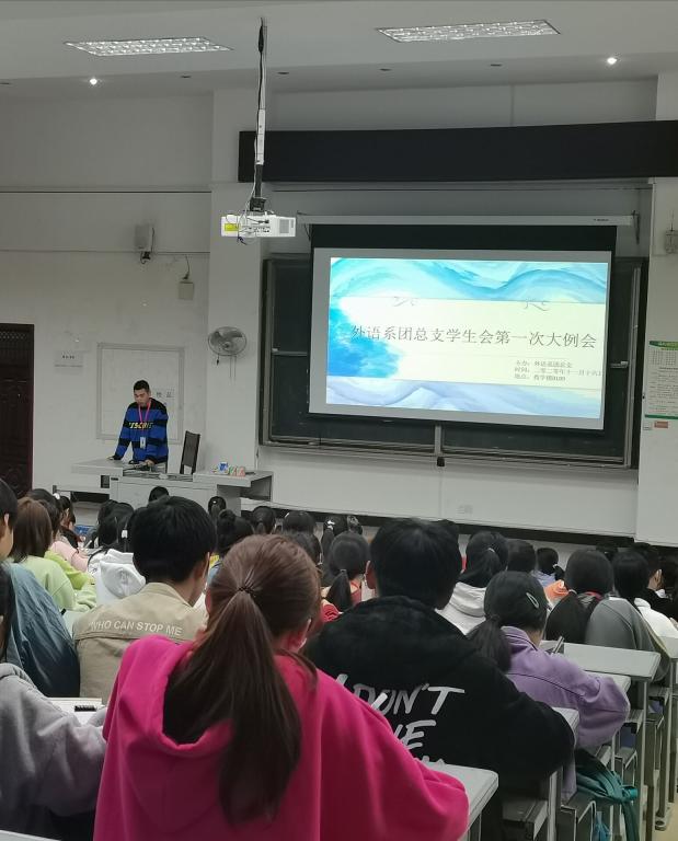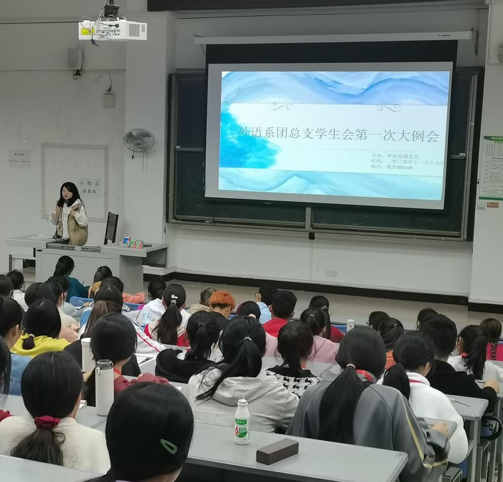 2020年11月16日下午6点10分,由四川职业技术学院外语系团总支学生会组织的第一次大例会在教学楼B309成功举行,参与此次例会的有外语系团总支书记王娅莉、以及19级的学生干部和20级的学生会各部门干事。