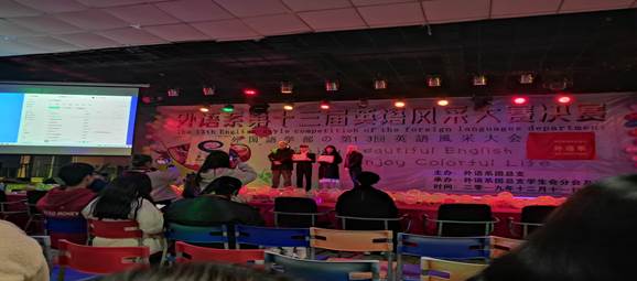 为激发大家学习英语的兴趣,由四川职业技术学院外语系团总支主办,外语系团总支学生分会和英语协会承办的“外语系第十三届英语风采大赛”决赛于12月11日19:30在二食堂三楼隆重举行。并且邀请了外语系团总支书记王娅莉老师、外教Tracey、外教Mr.T、外语系团总支副书记范诗茂、外语系学生会主席刘锦洋、外语系学生会副主席彭秋月、外语系各部门负责人以及英语协会负责人担任本次大赛的评委。