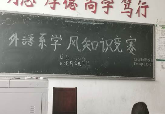 为树立学生的纪律意识和制度意识,建设文明校园。2019年11月20日中午12:30,由外语系团总支学生会主办,外语系学习部承办的学风校风知识竞赛初赛在尚学楼C303教室顺利举行。此次初赛选拔面向全体2019级同学,以个人考试答题的形式开展,共计二十多名同学参赛。