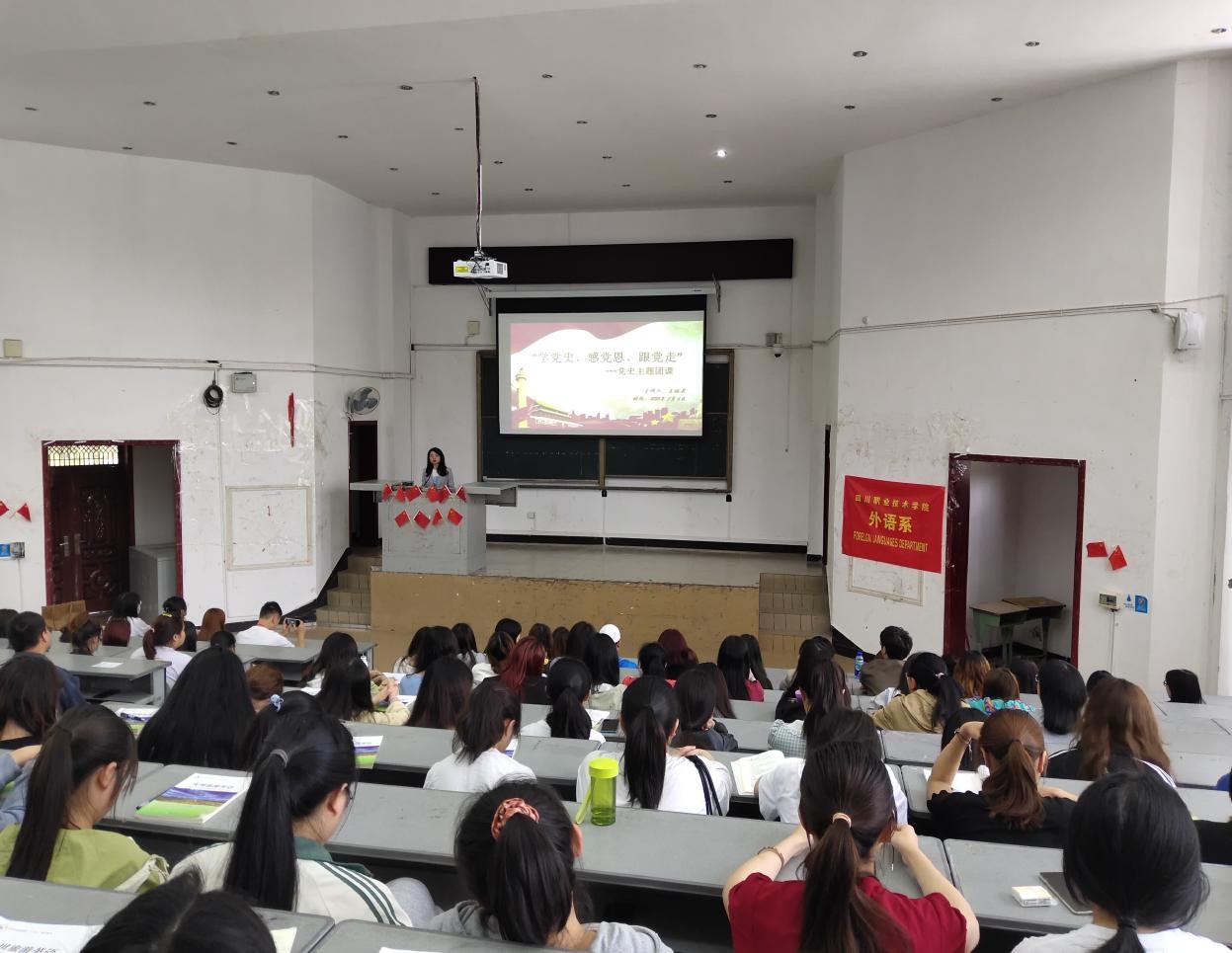 2021年5月6日下午4:00,由外语系团总支主办的“学党史,感党恩,跟党走”的党史主题团课在尚学楼D101顺利拉开帷幕。参与本次活动的有外语系团总支书记王娅莉,全体学生干部、入党积极分子和发展对象以及20级全体同学。本次活动主旨在学习党的历史,让同学们更好地汲取我们党和国家的历史经验,坚定理想信念。