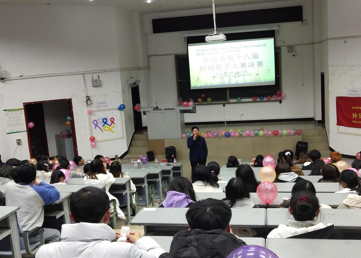 为了丰富学生课余文化生活,提高学生艺术修养,增强校园文化氛围,2020年11月26日晚上7:30,由四川职业技术学院主办,四川职业技术学院外语系团总支承办的外语系第十八届校园歌手大赛决赛在尚学楼D201顺利举行,出席本次活动的有外语系党总支副书记谭爱平,19级学生会各部门负责人,外语系20级新生和19级部分同学。