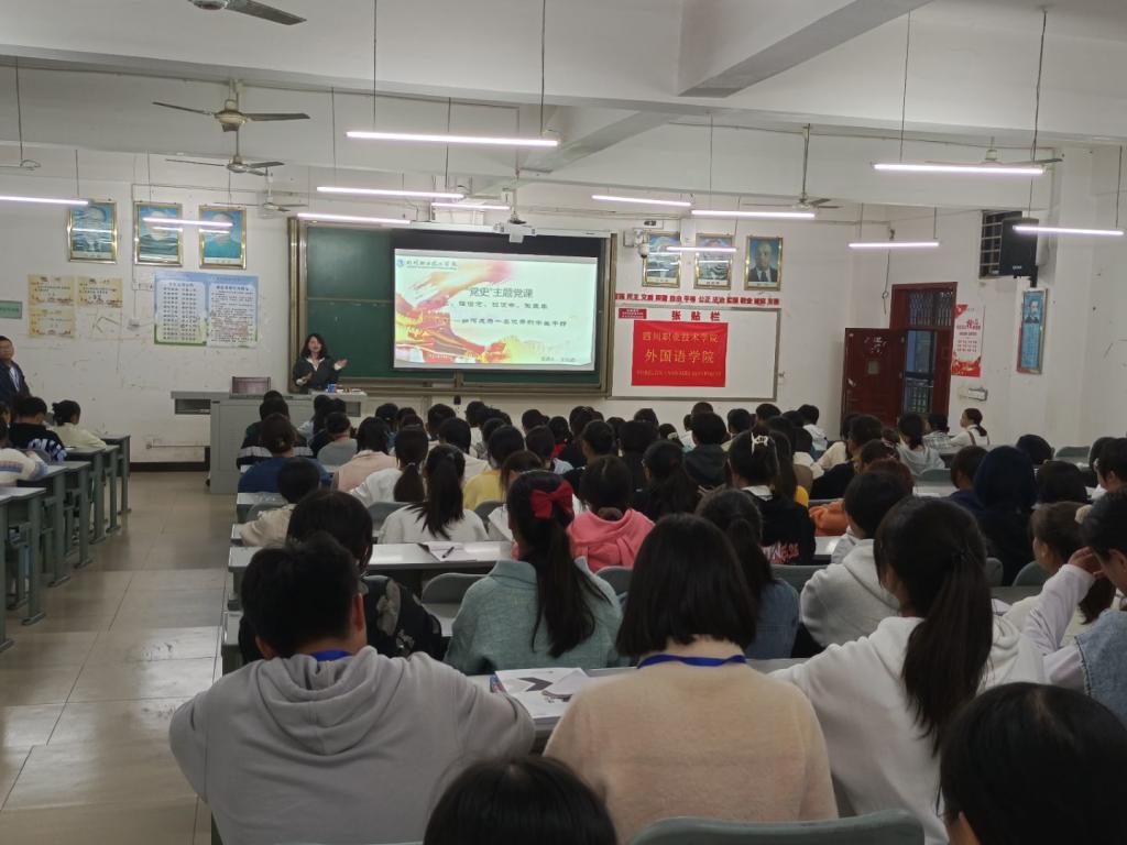 为进一步推动党史学习教育效果,强化学生干部队伍理想信念教育,将党史学习教育和学生工作有机结合,2021年10月15日晚18:10分,由外国语学院党总支副书记王娅莉主讲的“学党史、强信念、担使命、做表率——如何成为一名优秀的学生干部”主题党课顺利开展。外国语学院全体团学干部和入党积极分子参加。