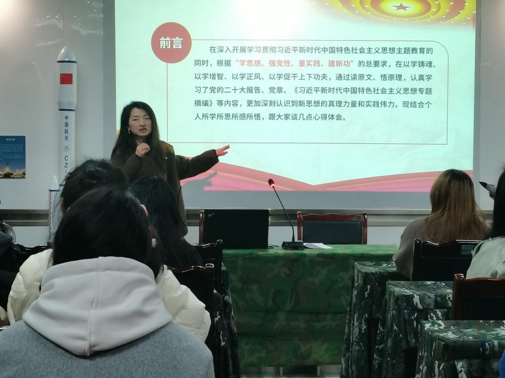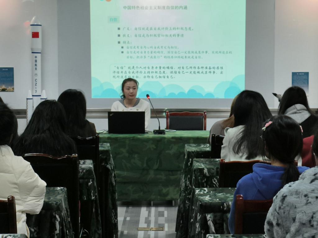翟莲围绕“坚定中国特色社会主义制度自信”为主题,从其来源、内涵、现实根据、意义和途径等几方面,深刻阐释了坚定中国特色社会主义制度自信的必然性和重要性,并结合现实根据,向大家分析了中国特色社会主义制度的优越性,翟莲大家提出三点希望,一是希望同学们加强政治理论学习,从认知中把握制度自信;二是提高思想觉悟,从思想上坚定制度自信;三是注重实践探索,从现实中提升制度自信。随后,王娅莉以“坚定理想信念,谱写青春华章”为主题,围绕“以学铸魂”、“以学增智”、“以学正风”、“以学促干”等几方面,与大家分享了学习贯彻习近平新时代中国特色社会主义思想主题教育的心得体会,结合同学们的实际情况,要求大家务必加强理论学习,筑牢思想根基,提升政治素养,同时,鼓励大家掌握科学的学习方法,提高学习效率,在思想上积极进步,在学习上步履不停,不负青春。