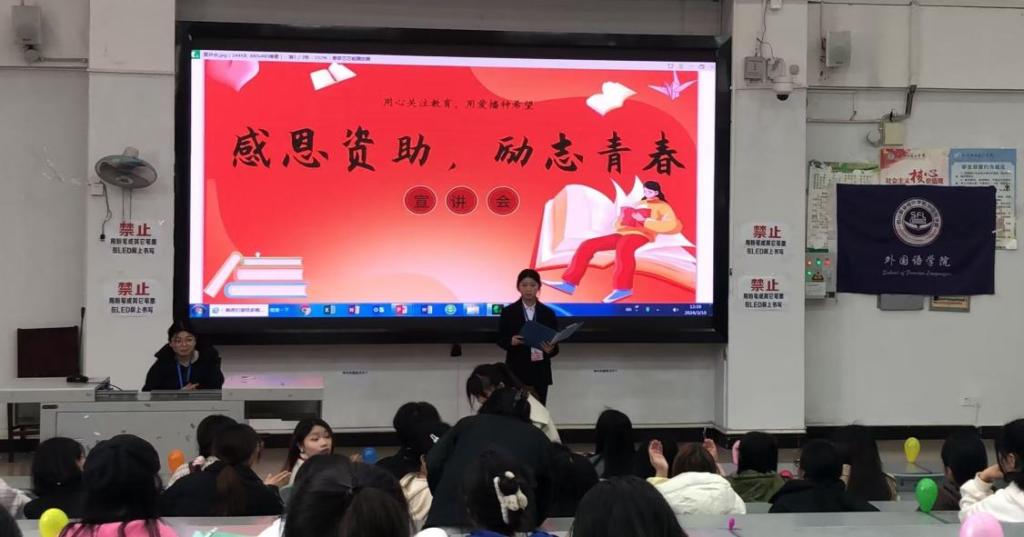 为进一步深化外国语学院全体学生对国家与学校资助政策的了解并全面贯彻落实高校资助政策,我院于2024年3月18日在尚学楼B109教室成功召开了“感恩资助,励志青春”宣讲会。外国语学院辅导员黄藴鑫‚廖星雯,团总支副书记代叶梦主席团及各部门负责人应邀出席了本次活动。